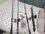 왼쪽에있는거 2개는 깨끗합니다 오른쪽두개는 망가진낚시대지만 사용가능합니다 그리고 가운데 있는거 도 포함으로 다드립니다 바로 낚시 가능 네고는 최대 5만가능합니다 많이 찔러주세요 낚시대 케이스4개는 서비스 입니다 망가진낚시대는 맨 마지막사진에 잘 나와있어요